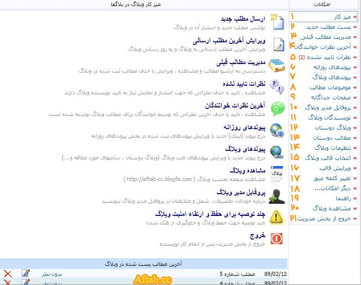 - میزکار: با کلیک بر روی این کلمه وارد صفحه اصلی و اولیه کنترل پنل وبلاگتا خواهید شد و از آنجا میتوانید به راحتی به تمامی قسمتهای وبلاگ خود دست یابید.