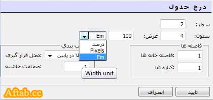 در فیلد قسمت عرض، شما میتوانید مشخص نمایید که عرض جدول بر چه اساس مشخص شود بر اساس پیکسل یا درصد و یا EM.