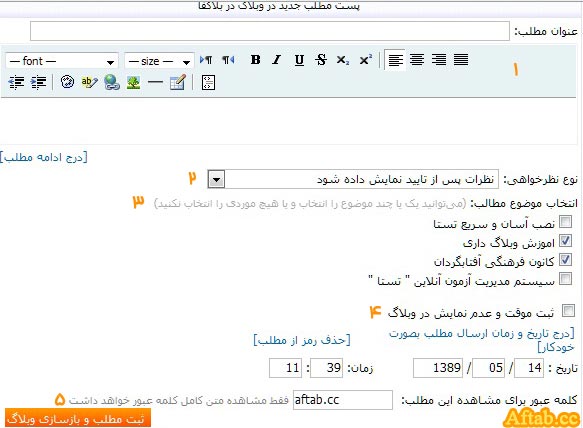 - در این قسمت که با شماره 4 در شکل مشخص شده که " ثبت موقت و عدم نمایش در وبلاگ " نام دارد شما میتوانید مشخص کنید که این پست در زمان دلخواه شما در وبلاگ به نمایش گذاشته شود نه درهمین لحظه به عنوان مثال شما در هفته بعدی به علت مسافرت به اینترنت دسترسی نخواهید داشت ولی نمی خواهید که وبلاگ شما به روز رسانی نشود شما میتوانید هر تعداد پستی که میخواهید نوشته و تاریخ نمایش و ساعت نمایش آن در وبلاگتان را نیز مشخص نمایید و سیستم به صورت خودکار در همان تاریخ و در همان ساعت پست شما را ارسال خواهد کرد و به این صورت بازدیدکنندگان متوجه عدم حضور شما نمی شوند و وبلاگ شما نیز در زمان عدم حضورتان به روز رسانی خواهد شد.