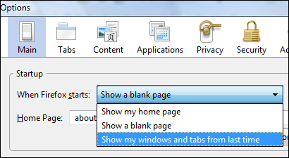 1- از منوی Tools گزینه Options را انتخاب کنید و طبق آنچه گفتم، گزینه When Firefox starts را روی Show my Homepage یا Show a blank page تنظیم کنی.
